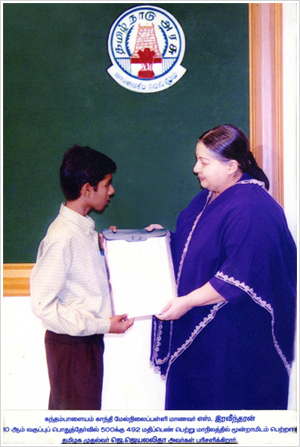 Our student Master S.Raveendran who stood STATE THIRD ( 492/500) and District First in X standard board examination receives award from the Chief Minister Dr.J.Jayalaitha